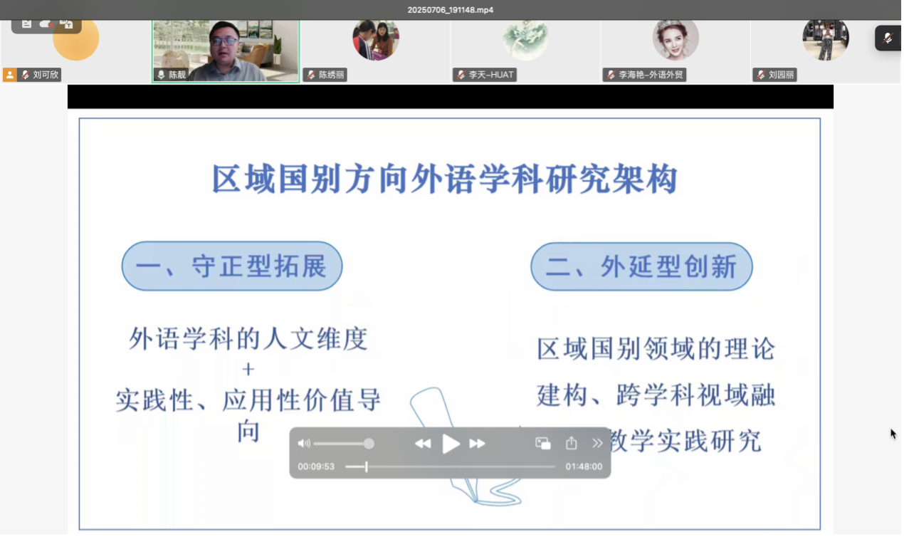 本网讯(文/图 刘可欣)7月6日晚,复旦大学外文学院副院长、博士生导师陈靓教授应邀为外语外贸学院教师带来了一场题为《区域国别视域下外语学科的科研规划及学科拓展》的学术讲座。讲座通过腾讯会议平台在线举行,会议由副院长翟全伟主持,全体外语专业教师参与会议。
